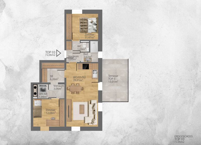 Die südöstlich ausgerichtete TOP 3 ist die zweite Wohnung im Erdgeschoss und verfügt über eine Fläche von rund 72,6 m². Über das zentral gelegene Wohnesszimmer betritt man die Terrasse (13m²) und den ebenerdigen exklusiven Eigengarten mit weiteren rund 74 m². Der Wohnung ist außerdem ein Kellerabteil (5 m²) und ein PKW-Abstellplatz im Carport zugeteilt.
