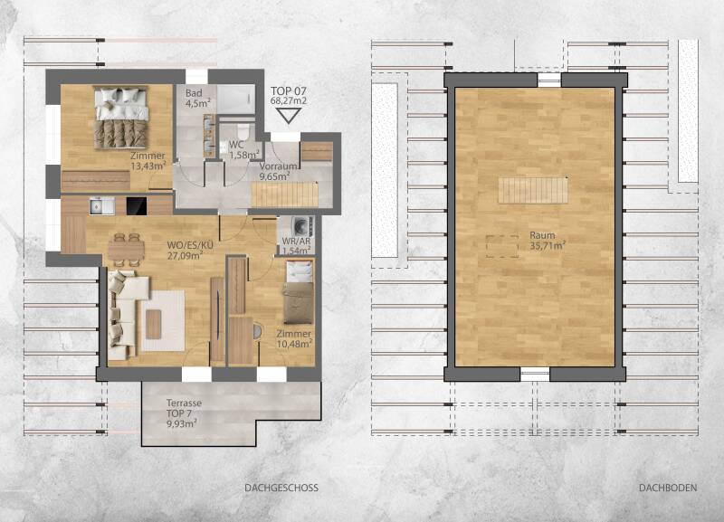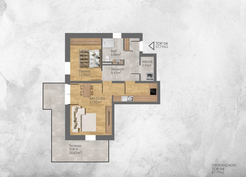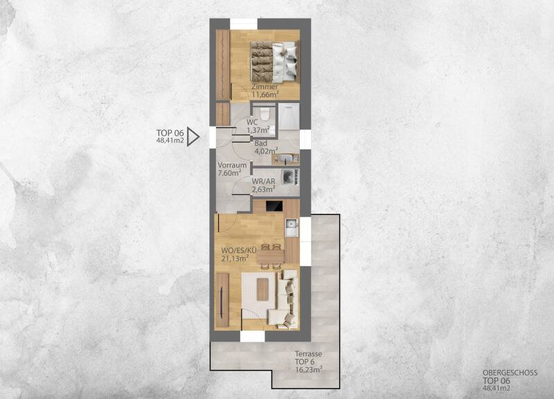 TOP 6 hat eine Süd-Ost-Ausrichtung. Von der äußerst großzügig errichteten Terrasse (rund 16 m²) schweift der Blick Richtung Markt/Kirche sowie zum Schöckl. Die Wohnung verfügt über rund 48,4 m². Außerdem ist der Wohnung ein Kellerabteil (4 m²) und ein PKW-Abstellplatz im Carport zugeteilt.