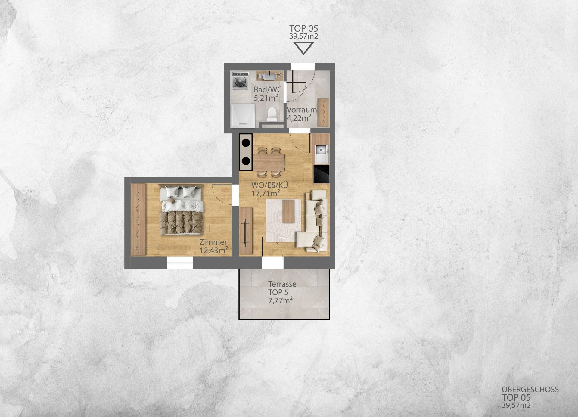 TOP 5 repräsentiert die ideale Starterwohnung für Singles oder auch jüngere Paare. In kompakter Form bietet sie alles um das erste Mal auf eigenen Beinen zu stehen. Die südlich ausgerichtete Wohnung verfügt über rund 40 m², einen Balkon mit rund 8 m² sowie ein Kellerabteil (rund 4 m²) und ein PKW-Abstellplatz im Carport.